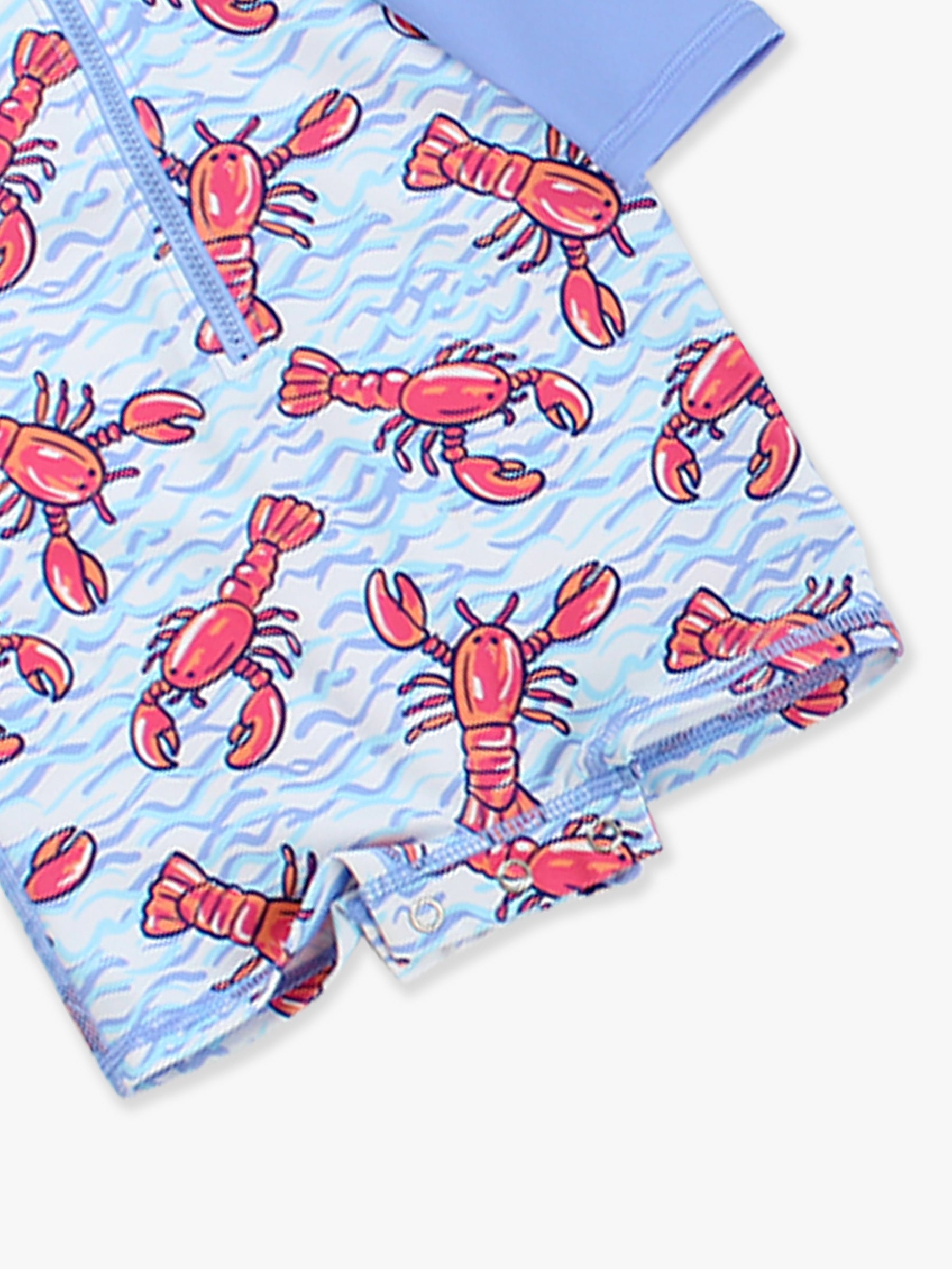 Adorable hand-drawn lobsters dance across ocean waves in this sweet coastal-inspired print! Perfect for beach vacations, crawfish boils, or even the 4th of July! Keep your little guy safe from the sun with this UPF 50+ Boys Long Sleeve One Piece Rash Guard. This full coverage one piece suit makes trips to the pool, lake or beach so easy for little crawlers. Snaps at bottom make for easy changing. Made with sun protected fabric for all day protection and comfort.