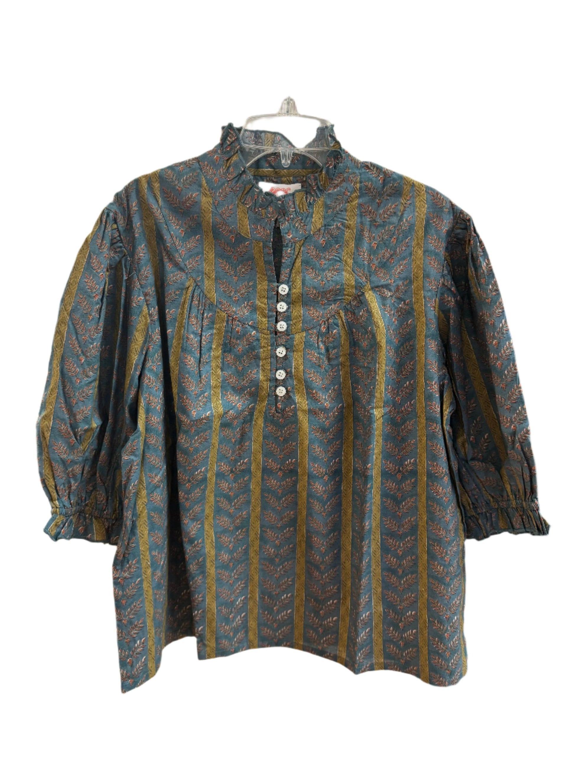The Ellie Blouse features a small ruffle detail on the collar, 3/4 buttons on the bodice, and elbow length puff sleeves.